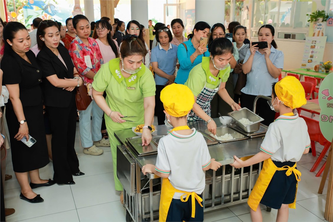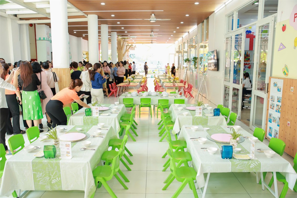 Bên cạnh phần báo cáo, các đại biểu đã tham dự hoạt động thực tế giờ ăn của trẻ mẫu giáo tại khu ăn tập trung, trực tiếp quan sát quy trình tổ chức, cách trẻ tham gia và thực hiện các kỹ năng trong giờ ăn.
