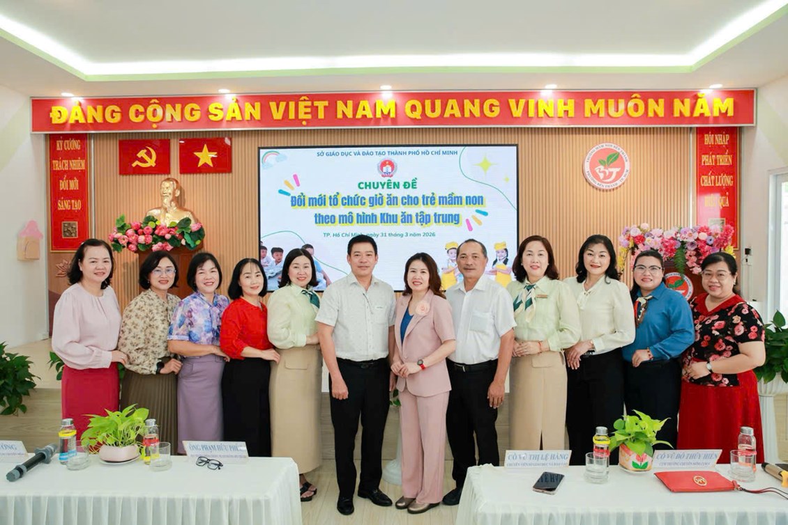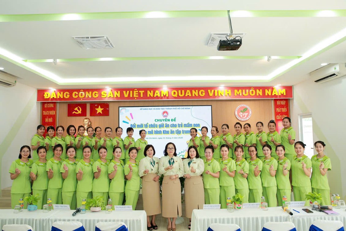 Sáng ngày 31/3/2026, Trường Mầm non Bến Thành đã tổ chức thành công chuyên đề “Đổi mới tổ chức giờ ăn cho trẻ mầm non theo mô hình khu ăn tập trung” thuộc Cụm chuyên môn 5 – Thành phố Hồ Chí Minh.